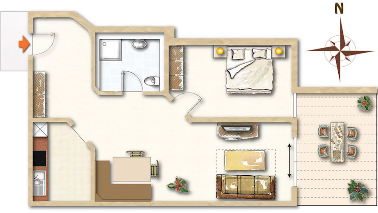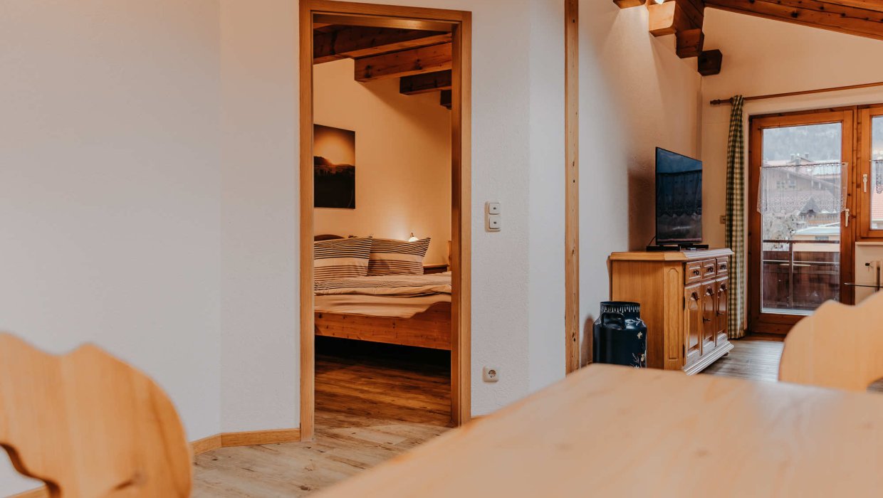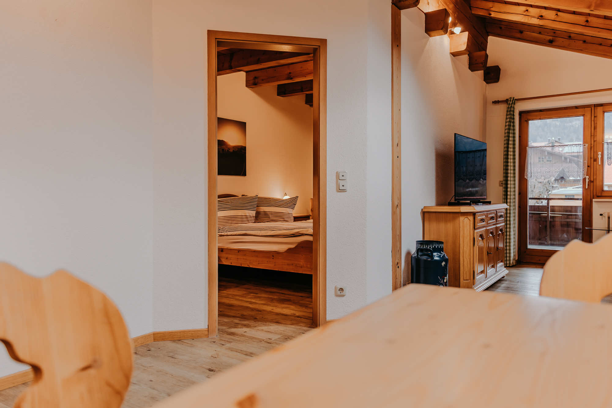 Dachgeschoß Wohnung mit separatem Schlafzimmer. Ein eigener Safe, ein geräumiges Wohnzimmer mit gemütlicher Eßecke und großer Couch.
