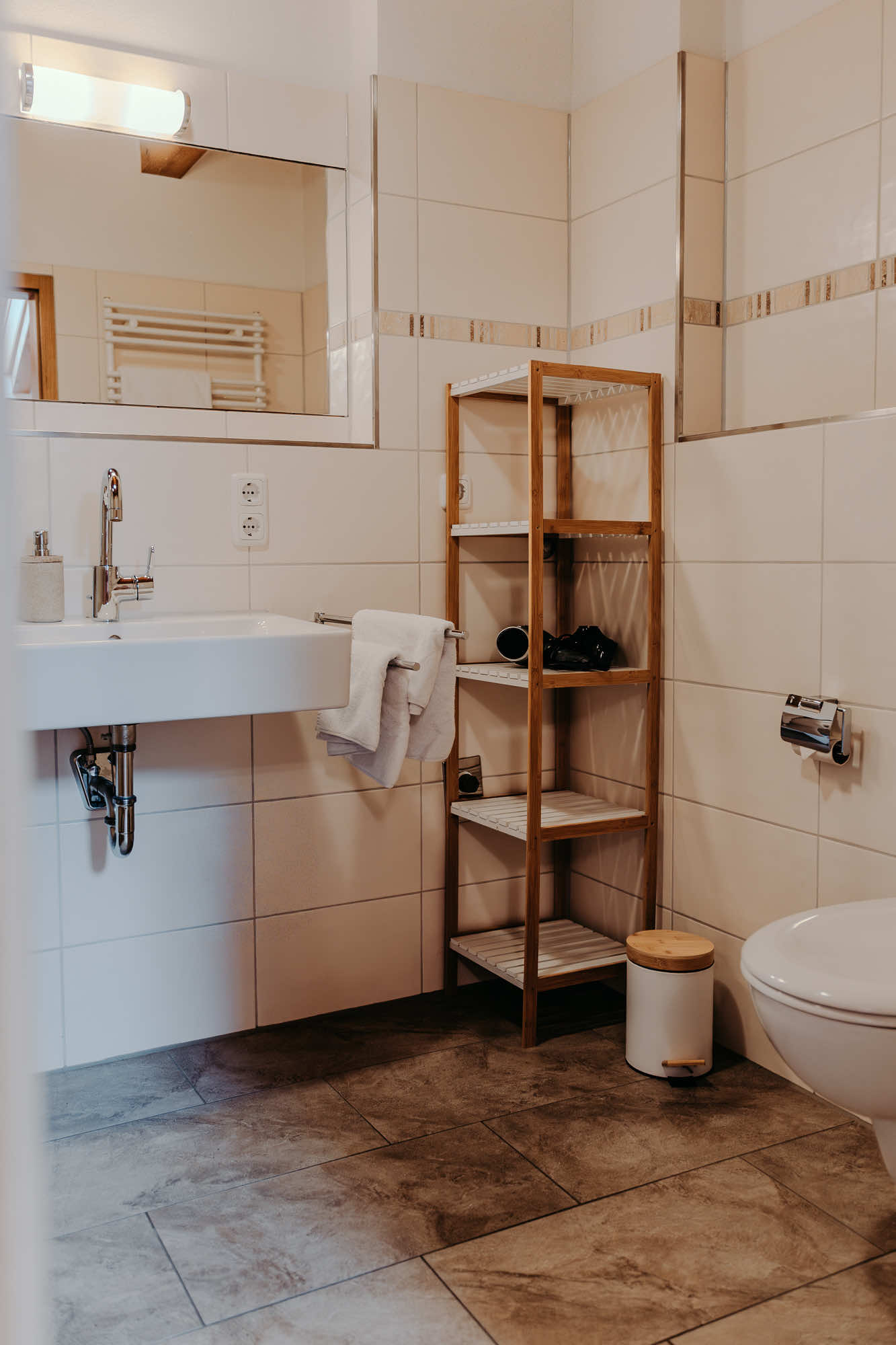 Das Bad verfügt über eine begehbarerer Dusche sowie WC. Handtücher & Bettwäsche sind inklusive. Der große, überdachte Ostbalkon bietet traumhafte Gipfelgblicke zum Iseler.