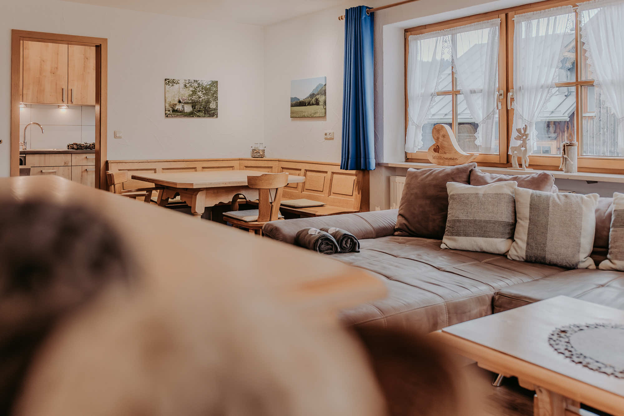 Der helle Wohnbereich mit großer Couch und Essecke lädt zum Zusammensitzen ein – egal ob nach einer Wanderung, einem Skitag oder einfach für einen gemütlichen Abend. Durch die klare Raumaufteilung wirkt die Wohnung luftig und angenehm ruhig.