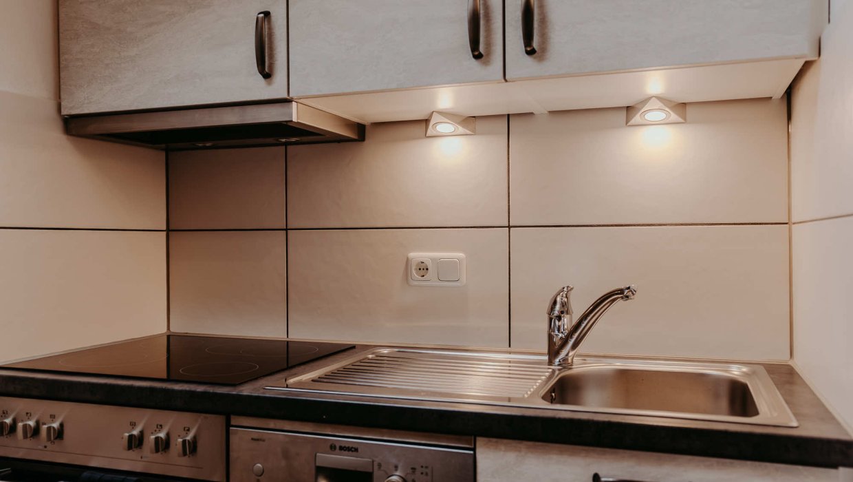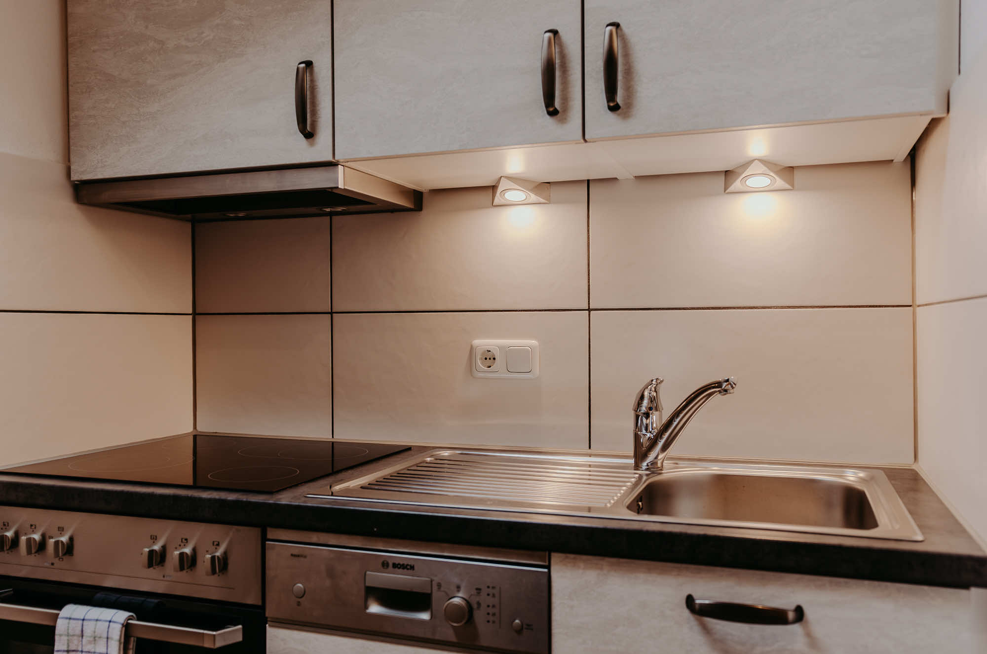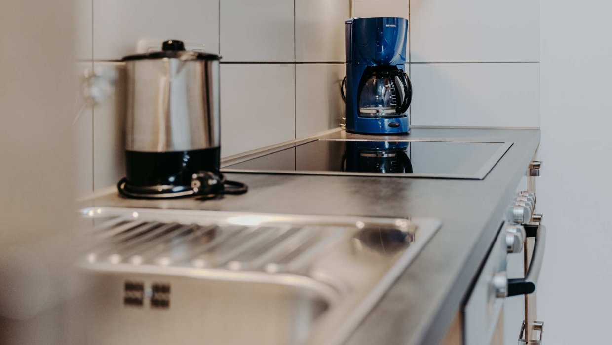 Die kleine, separate Küche ist funktional und komplett eingerichtet. Geschirrspüler, Kaffeemaschine, Wasserkocher, Toaster und weitere Küchenhelfer stehen bereit. Auch an die praktischen Dinge des Alltags wurde gedacht: Spülmittel, Seife und Toilettenpapier sind inklusive. Bettwäsche und Handtücher werden selbstverständlich gestellt.