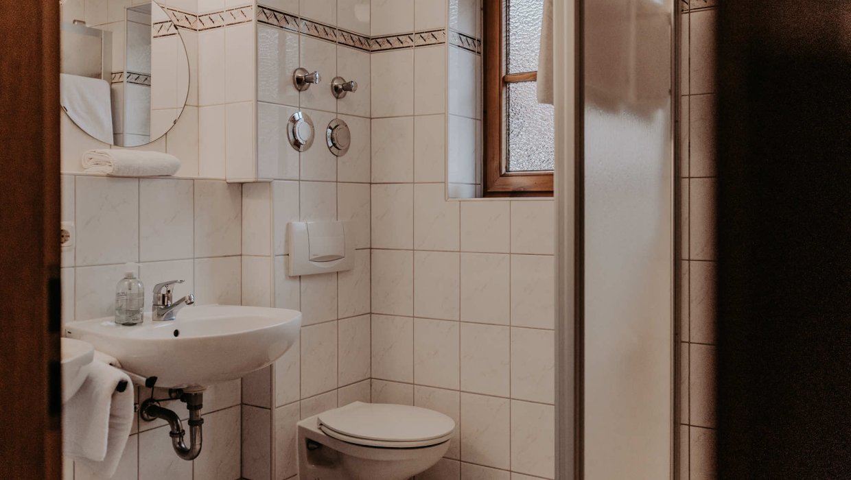 Neben dem Badezimmer mit Dusche und WC gibt es ein zusätzliches separates WC, was den Aufenthalt für Familien deutlich komfortabler macht. In den Sommermonaten wird der große Westbalkon mit Bergblick schnell zum Lieblingsplatz – Sonne, Weite und Allgäuer Bergluft inklusive.