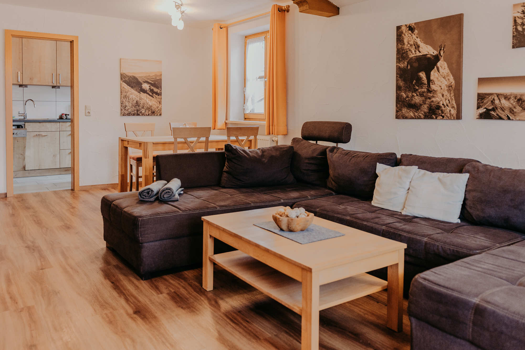 Der großzügige Wohnbereich mit großer Couch und Essecke bildet das kommunikative Zentrum der Ferienwohnung. Hier ist Platz für gemeinsame Mahlzeiten, Spieleabende oder entspannte Stunden nach einem aktiven Tag in den Bergen. Trotz Dachgeschosslage wirkt die Wohnung luftig und angenehm offen.